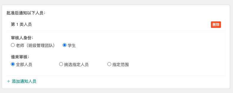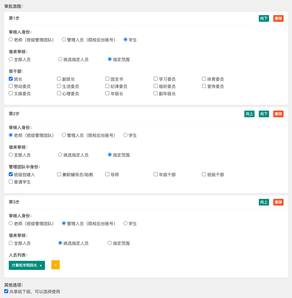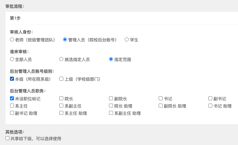 开通院校后台(查看步骤)后,在创建自定义流程时,审核人身份中会额外提供“管理人员(院校后台账号)”的选项。您可以从院系本级或学校级的管理人员中指定具体的审核人,或者具备特定职位的人员来审批: