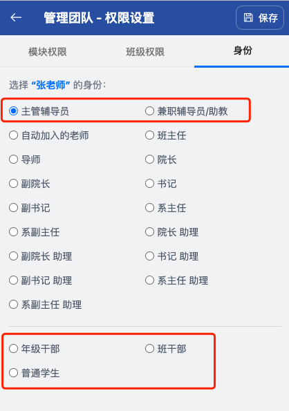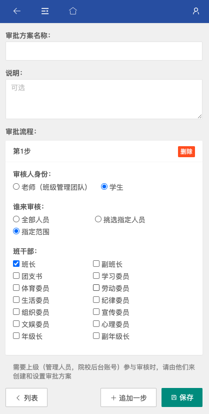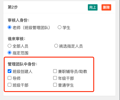 每一步可以设置审核人的身份和具体人或职务,比如上图是”学生”中的”班长“来审核。老师可以通过管理团队中的身份来指定: