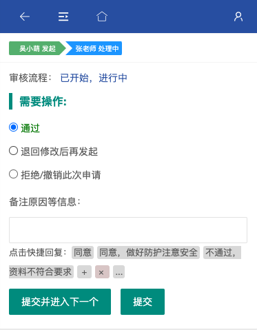 - 通过:该步骤审批通过。如果没有下一步了,该申请就审批完成了。如果有下一步,还需要选择下一步发送给谁审批,直至所有步骤都审批完成。