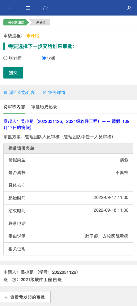 默认状态是“未开始“,即学生需要从列出的审批人中选择一人提交审批申请。系统会根据审批流程列出所有符合条件的审批人。