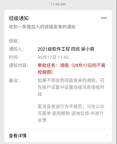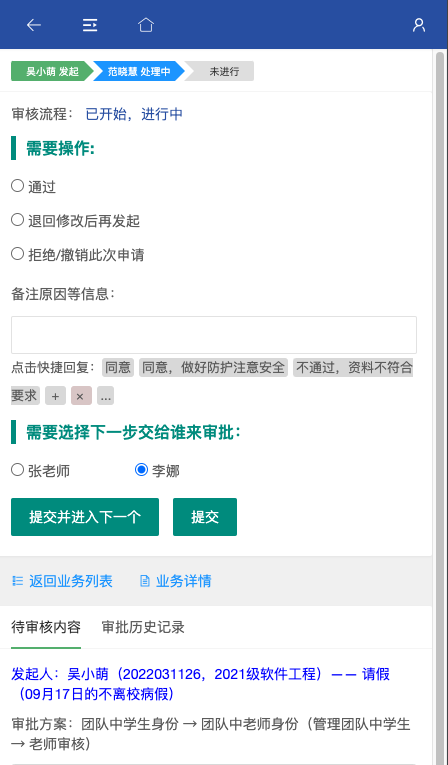 老师(或在审批流程中的学生)在收到待审批的通知时,点击即可进入审批界面。